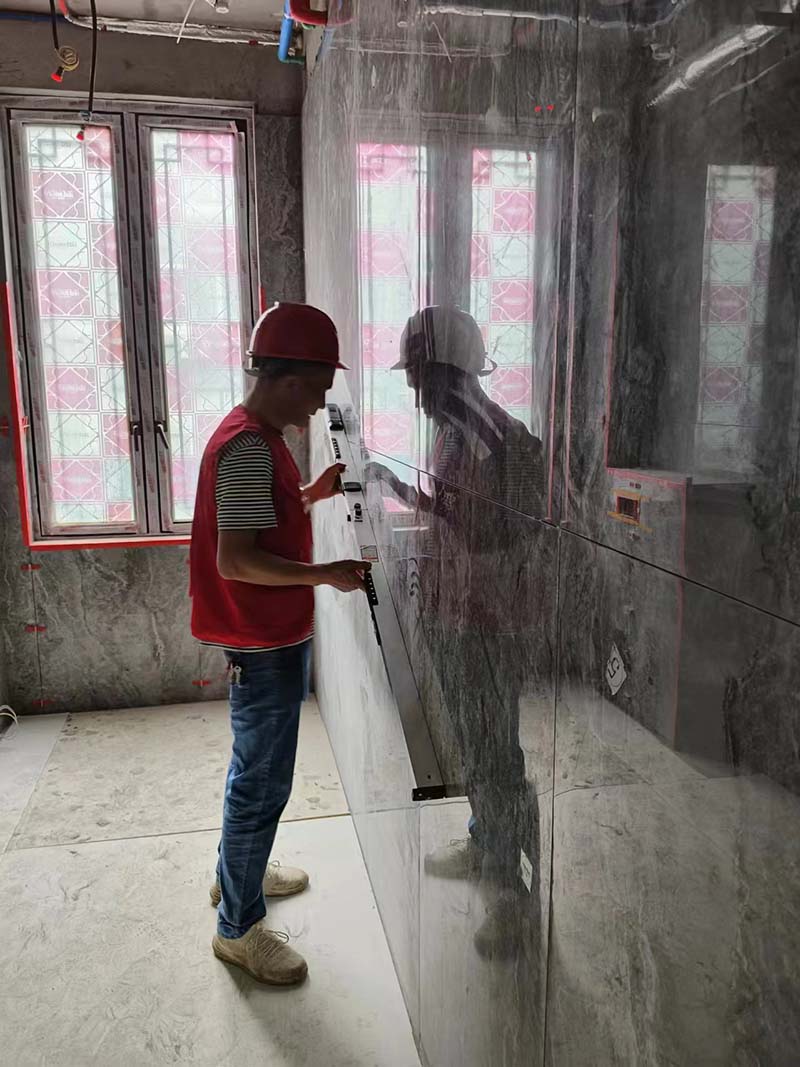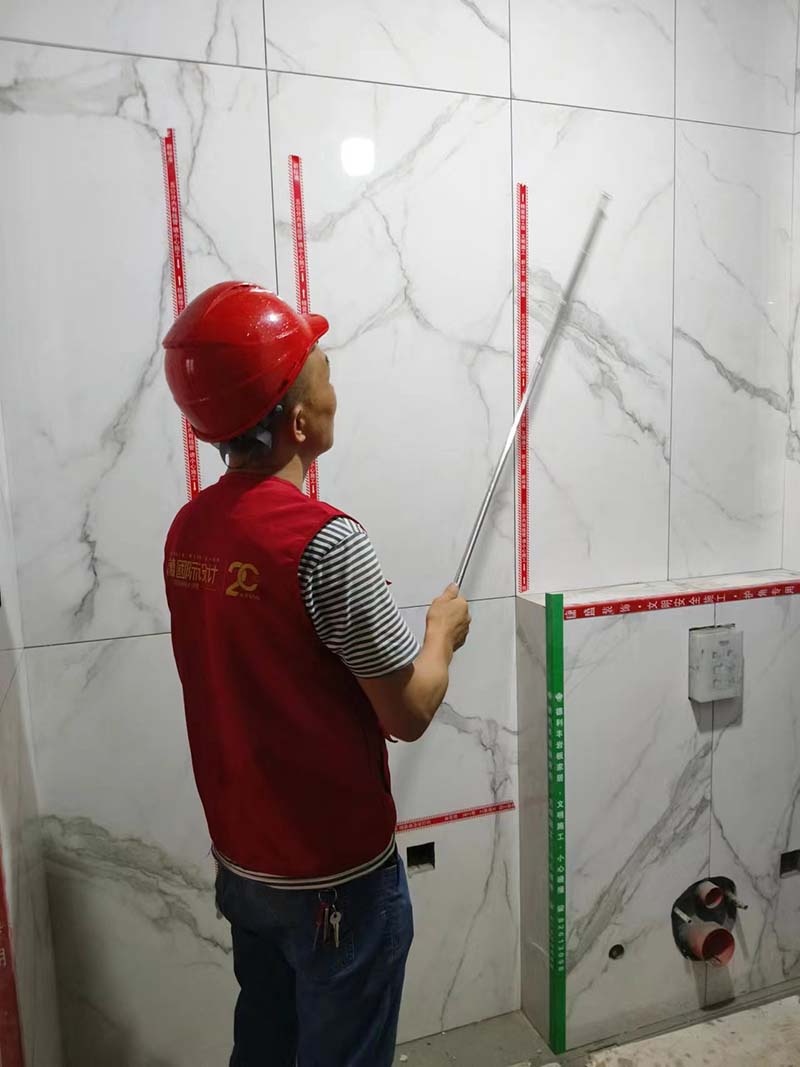 ▲检查墙面砖平整度