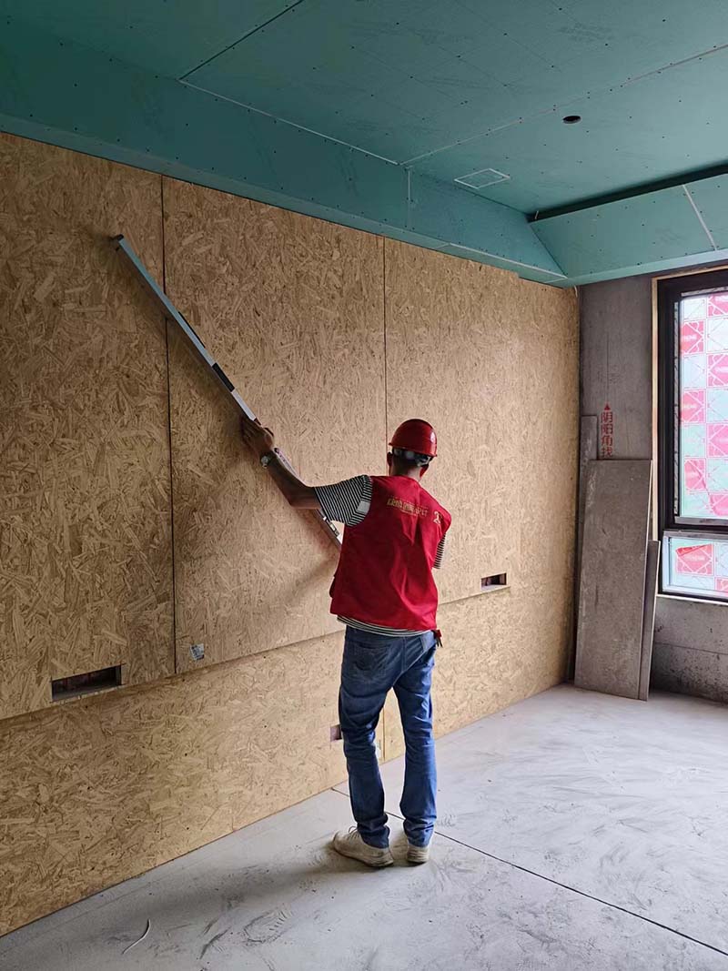 ▲检查墙面木基层平整度