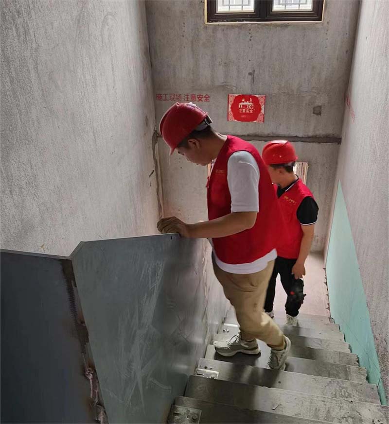 ▲检查钢架楼梯扶手安装收口
